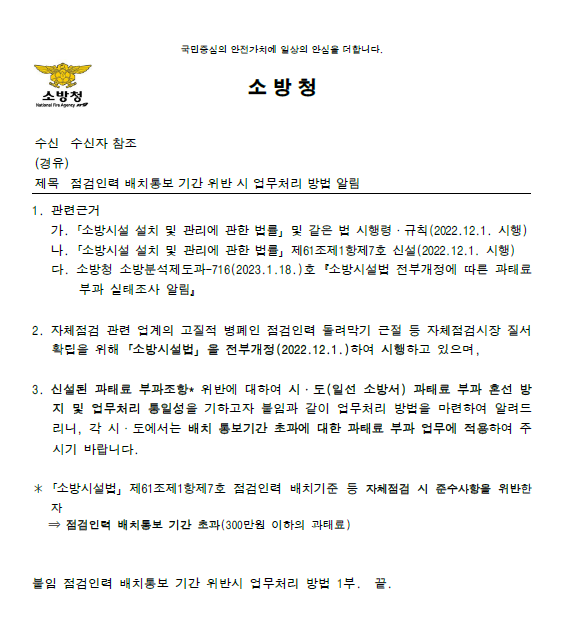 점검인력 배치통보 기간 위반 시 업무처리 방법 알림(소방청)